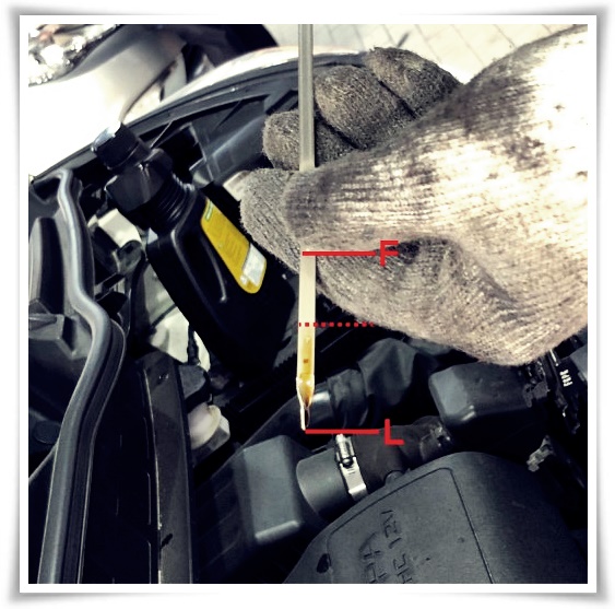 모든 내연기관 차량에는 후드(보닛)를 개방 후 엔진오일 게이지를 뽑아 한 번 흰헝겁 등으로 닦아준 뒤, 다시 끝까지 찔러 넣었다가 뽑아보면 게이지 끝에 오일이 얼마나 묻어나는지 육안으로 확인할 수 있습니다.