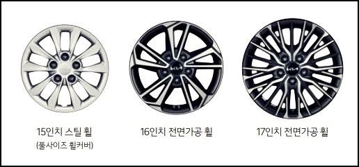 심심한 옆태에 활력을 불어넣어 줄 K3 휠은 총 3가지로 트렌드 등급만 15인치 스틸 휠이 장착되고 옵션 추가가 가능합니다. 프레스티지 등급부터는 16인치 전면가공 휠이 기본 장착되며, 17인치 전면 가공 휠은 노블레스 등급부터 기본 사양으로 적용됩니다.